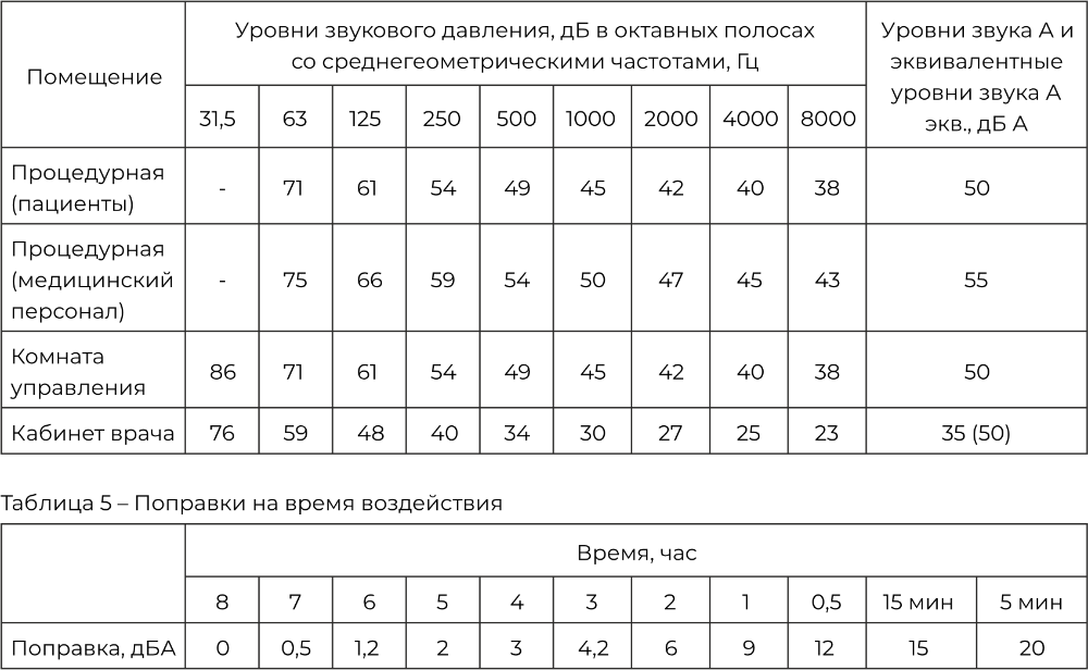 Причем оценка уровней шума, воздействующего на медицинский персонал в процедурной и комнате управления, должна проводиться с учетом времени воздействия шума (таблица 5). Для пациентов в процедурной при превышении допустимого уровня шума должны быть предусмотрены средства защиты органов слуха.